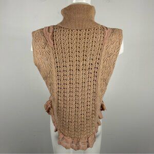 This elegant tan cable knit sweater vest features a stylish turtleneck and intricate lace detailing. Perfect for layering, it adds a touch of sophistication to any outfit.