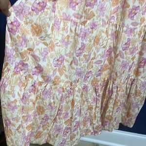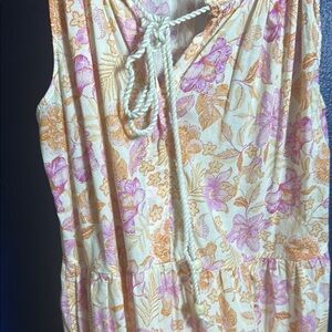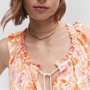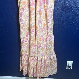 Elegant maxi dress by Mango. Features floral pattern. Soft pink and orange hues. Perfect for summer. 100% cotton fabric, straight design, Rounded neck with a cord detail, wide straps, flared him.