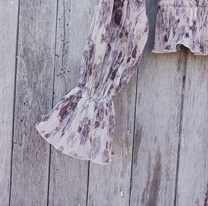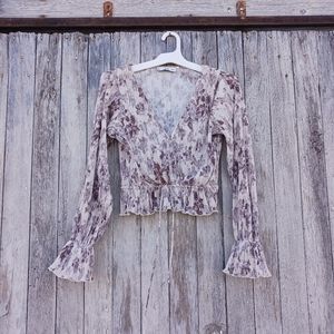 It's a cream and brown floral v-neckline, peplum pleated style of blouse. It's in great pre-owned condition, Size XS