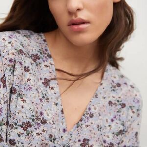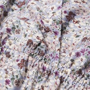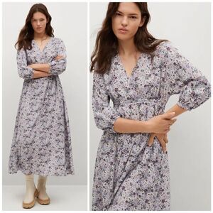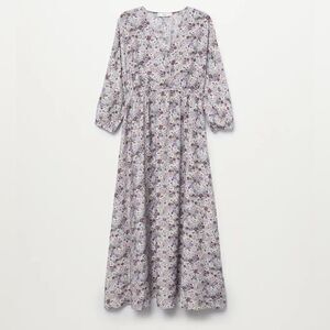 Flowy fabric. Midi design. Flared design. Printed design. Floral print. V-neck. Three quarter sleeve. Elastic waist.