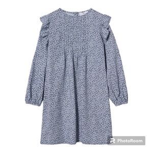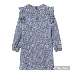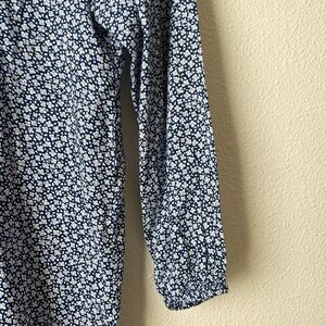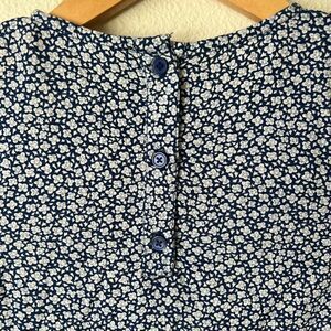 Flowers print. Evasé design. Short design. Rounded neck. Long sleeve. Ruffles detail. One button fastening.