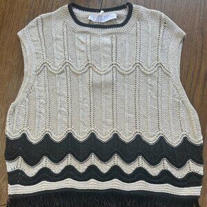 straight, cropped, and two-tone design, rounded neck, and fringed finish