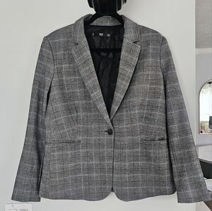 Mango Gray Blazer with Notched Lapels and Plaid Pattern