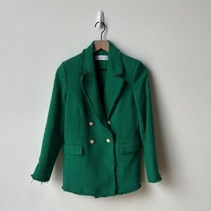 This Mango blazer in a striking green hue offers a sophisticated and tailored fit, perfect for professional settings. Its structured design and high-quality fabric ensure a polished look, making it a versatile addition to any wardrobe.