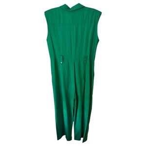 New with tags green sleeveless jumpsuit from Mango. Structured but breathable fabric with a button-down front, collar, and two decorative waist tabs with snaps. Green waist belt included. Relaxed straight leg and hidden zip closure. Great for work or casual wear.