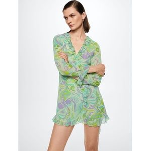 Stylish mini dress with a vibrant green and purple pattern. Features a wrap design and ruffled edges. Perfect for a chic look.
