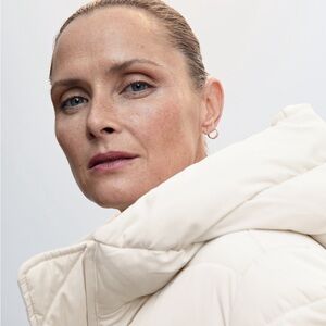 Hood quilted coat. Water-repellent technical fabric. Quilted design. Zipper pockets on both sides. With filling. Inner lining. Zip fastening. Off White Color. NWT