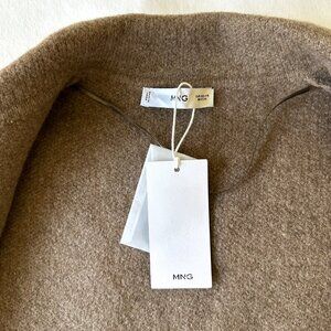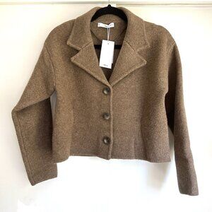 MANGO light brown knitted jacket with a modern cropped silhouette and a classic notched lapel collar. Crafted from a soft texture wool blend with a relaxed fit, this is a women's size XS, which is comparable to a US 4 and fits true to size. In excellent condition, no flaws, from a smoke-free, pet-free home.