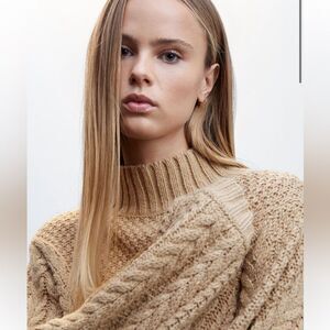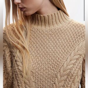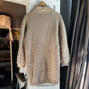 Thick knit weave with braided pattern. High collar. long sleeves. Short mini design. Straight fit. Must have dress for fall from Mango in gorgeous tan. A blogger favorite - style this with boots or flats for a perfect cozy look. Very good preloved condition. Similar styles in Tuckernuck’s fall recommendations!