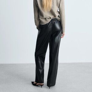 Leather effect. Jogger design. Elastic waistband. Side pockets. Bow on the waist. The model is 1.78 tall and is wearing a size 36. Straight design.