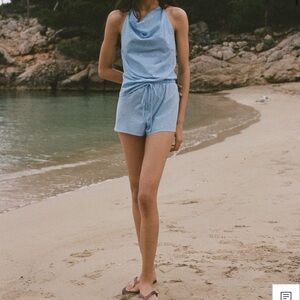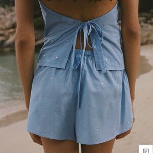Light blue set with sleeveless design. Features subtle embellishments. Drawstring waist for adjustable fit.