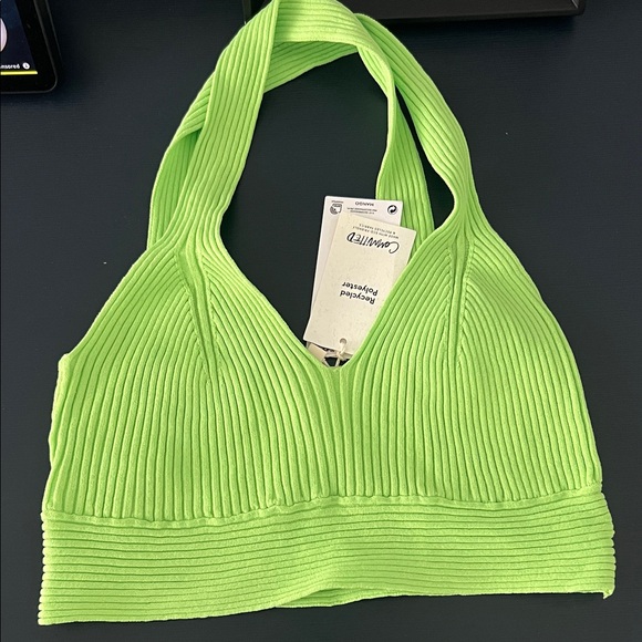 Bright lime ribbed bralette. Offers comfort and style. Ideal for daily wear.