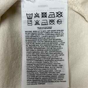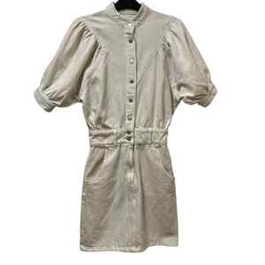 Made from 100% cotton and features a short stand up collar, V yoke, short puffed sleeves with snap closure cuffs, belt loops, side pockets, and snap closure, button and zipper fly on the front. Natural colored denim is more off-white or cream colored. Measures 19” armpit to armpit and 25” shoulder to hem. Perfect neutral to make your own with a scarf and belt!