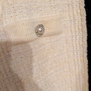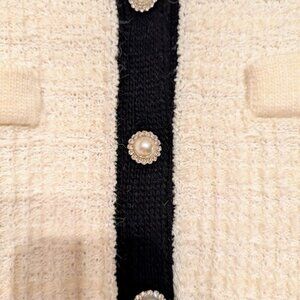 This beautiful Chanel dupe tweed cardigan features crystal button embellishments and a contrasting trim. Pair with trousers or matching tweed skirts, silk camis, and pearls or gold jewelry for the perfect Quiet Luxury look!