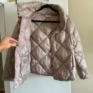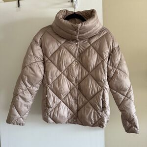 Mango MNG Satin Diamond Quilted Short Puffer Jacket High Neck Taupe Size XXS