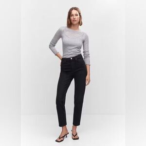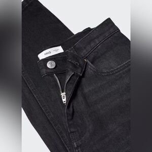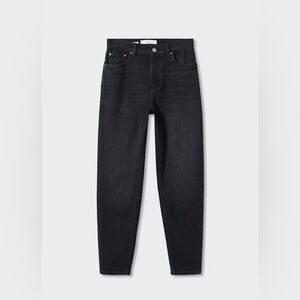 Cotton-blend fabric. Denim style cotton fabric. Elastic. Mom-fit. Ankle brace. Five pockets. Loops. Zip and one button fastening.