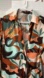 Vibrant mini-midi wrap dress with abstract patterns. Features a tie-front detail. Perfect for a bold look. Worn once.