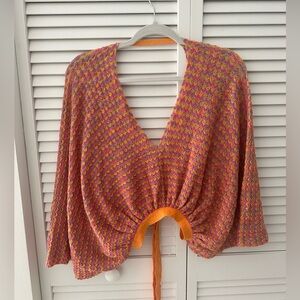 Vibrant knit top with a relaxed fit. Features a mix of pink, orange, and yellow hues. Perfect for casual wear.