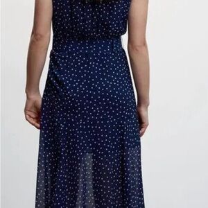 Chic navy dress with white polka dots. Features a stylish halter neckline. Ideal for versatile occasions.