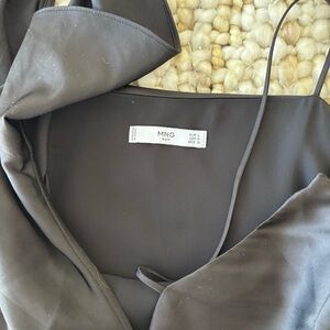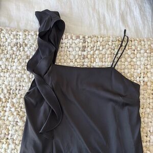 Like new - no signs of wear. This satin black mini dress from Mango has a simple shape with one ruffle shoulder for interest. Perfect going out or little black dress.