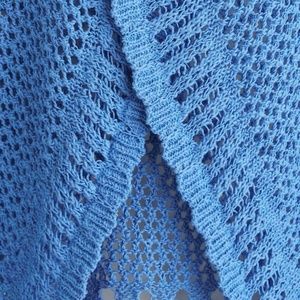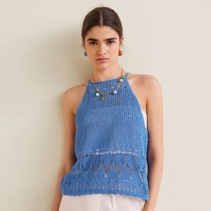 Beautiful and summer-y, sky blue open back, crochet halter top from Mango. Made from recycled cotton-blend, open-knit fabric.