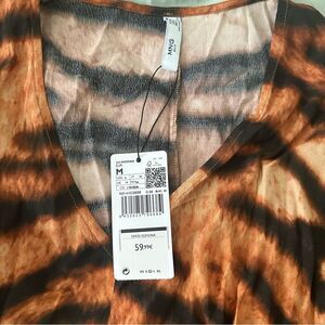 Step into casual elegance with this Mango sundress, featuring a striking orange and black tiger stripe pattern. The dress boasts a flattering V-neckline and long bell sleeves, perfect for resort wear. Its lightweight fabric and A-line cut ensure a relaxed and fluid silhouette.