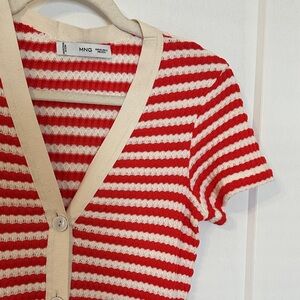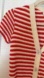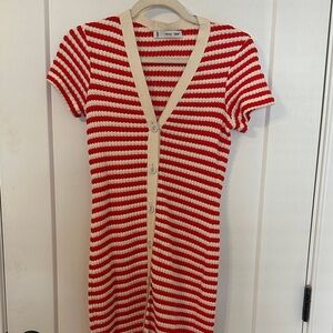 Stylish orange and white striped knit maxi dress. Features a button-down front. Short sleeves with a V-neckline.