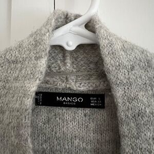 Cozy and stylish open-front cardigan from Mango. Made from a soft, textured knit in a neutral gray with contrasting blue chevron pattern along the hem and cuffs. Features a relaxed fit, shawl-style collar, and long sleeves for effortless layering. Perfect for casual wear, lounging, or adding a touch of pattern to a minimalist outfit.
