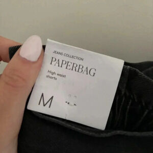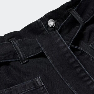 Denim style cotton fabric. Paperbag. Short design. High waist. Two patch pockets on the front. Two welt pockets on the back. Zip and one button fastening. Adjustable belt.