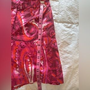 Vibrant pink jumpsuit with abstract patterns. Button-up front. Short sleeves. Perfect for casual outings.