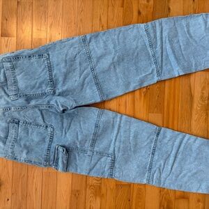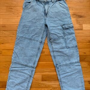 Size 4. Denim style cotton fabric. Cargo design. Straight design. Medium waist. Side pockets. Side pocket. Two patch pockets on the back. Decorative seams. Loops. Zip and one button fastening. Inside length 75 cm. Festival Season.