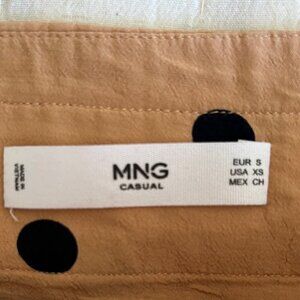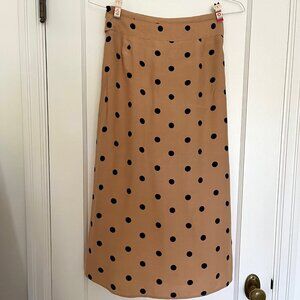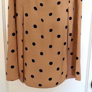 This adorable tan straight midi skirt with black polka dots features tie waist, hidden side zipper and double slits in front.