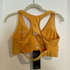 Soft, comfy, mango-colored racerback sports bra in a size medium from the brand WOLVEN. Has not been worn and still has a tag.