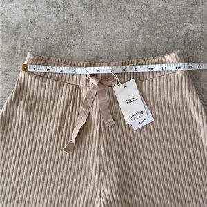 Rib knit fabric. Fine knit fabric. Short design. High waist. Elastic waist with adjustable drawstring.