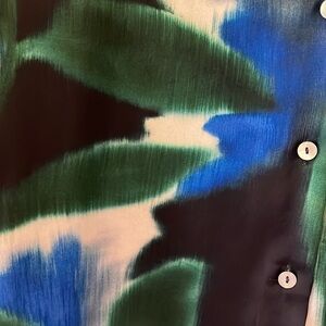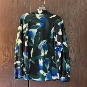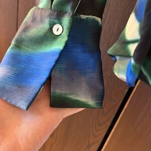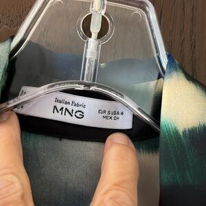 Mango Rothko print satiny button up shirt. Long sleeved. Artful pattern. Colors of blue, green, black and cream. Size 4