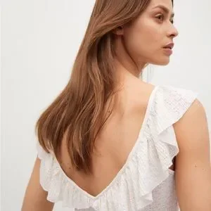 Brand new, with tags. Textured fabric. Elastic. Openwork knit fabric. Cropped design. Tailored dress. V-neck. V-neckline in the back. Ruffled straps. Sleeveless. Adjustable cord.