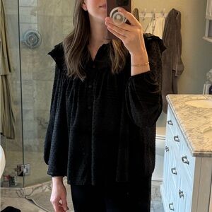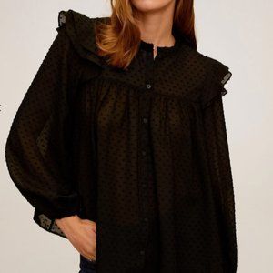 Mango ruffled embroidered blouse. Black with swiss dots; button down. Size 4.