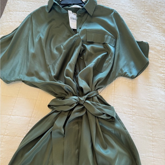 Stylish shirt dress in sage green. Features a classic collar and button front.