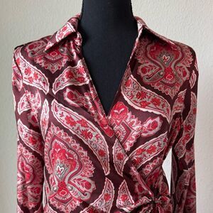Mango Satin Paisley Print Shirt Dress Wrap Midi Size 6 Burgundy Red