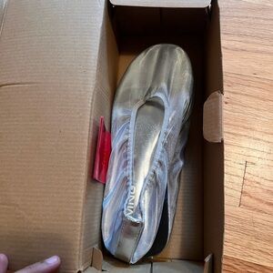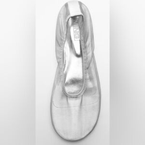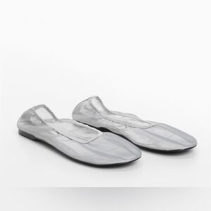 These Mango flats feature a sleek silver finish and a minimalist design, perfect for adding a touch of modern elegance to any outfit. The black elastic straps ensure a secure fit, while the flexible soles provide comfort and ease of movement. Ideal for both casual and formal occasions, these shoes combine style and functionality effortlessly. Size 39