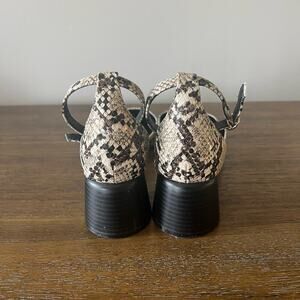Chic snakeskin patterned heels. Features a stylish ankle strap. Perfect for any occasion.