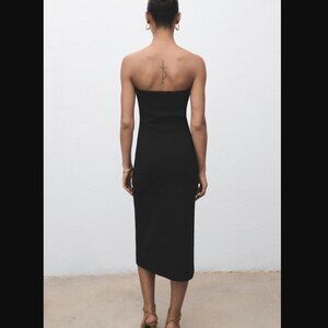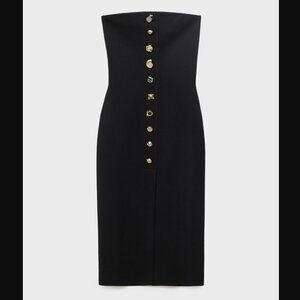 Fine knit fabric. Midi design. Fitted design. Strapless. Sleeveless. Front opening on the hem. Jewel-effect buttons. Front button closure.