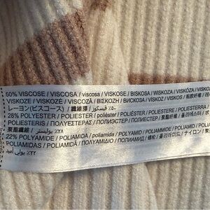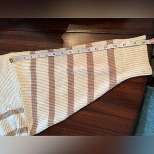 Cozy chunky cropped knit sweater from Mango in soft viscose. Roll neck, 1/4 zip with silver tone hardware. Drop shoulders, oversized. Cream base with tan/camel stripes.