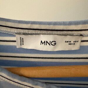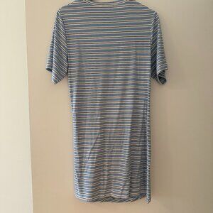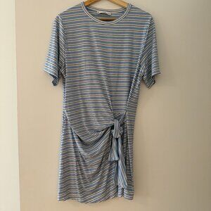 Short design. Straight design. Striped print. Crew neck. Short sleeve. Knot detail at the waist. Adjustable knot. No closure.