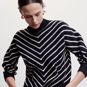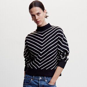 Thick knitted fabric. Straight design. Striped print. High collar. Long sleeve.