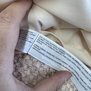 Color/Pattern: Beige with pink textured tweed/bouclé weave; gold-tone trim at neckline
