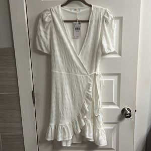 Textured fabric, Short design, Crossover design, Crossed V-neck, Puffed short sleeve, Elastic finish, Side bow fastening, Inner lining,