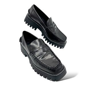 These burgundy leather loafers are so dark they could pass for black. They feature a squared toe and a substantial lug sole. Elevate your Fall and Winter fits with these shoes.