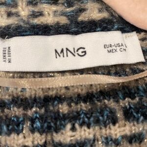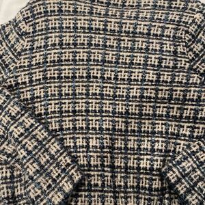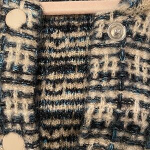 Worn just a few times! Like new Mango tweed bomber jacket. Size SMALL. Elastic at waist and cuffs, hits at hip, snap closure, unlined. Tweed is green,black, beige with some gold threading.