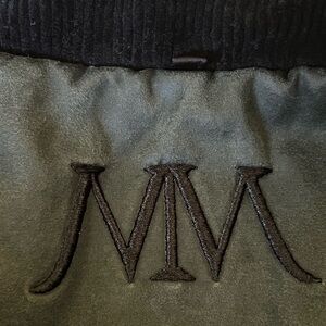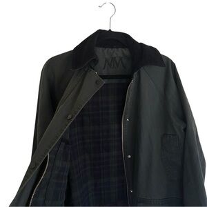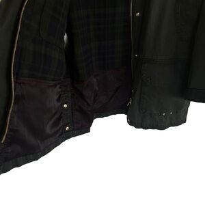 Greenish Black, cotton-blend jacket with a straight, oversize design. Has a corduroy collar, zipper and snap button closures on front, two patch pockets on the front and two side pockets. Preowned. Some pilling inside lining but otherwise in good condition.